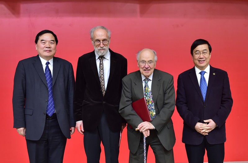报告会前,中国科学院院士、复旦大学校长许宁生为迈克尔·阿蒂亚和阿兰·孔耐颁发复旦大学荣誉教授聘书。受聘仪式由中国科学院院士、复旦大学常务副校长包信和主持,公众报告由上海市数学会理事长陈晓漫教授主持。